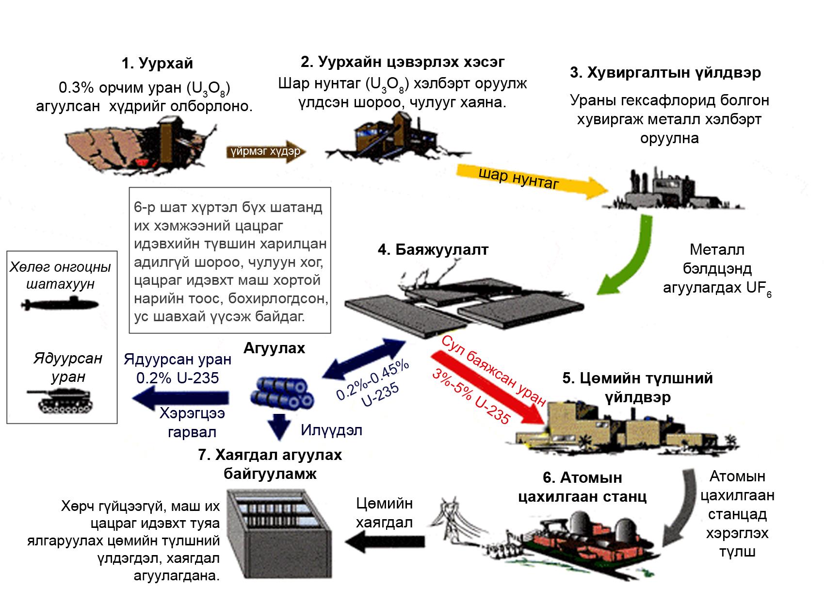 | Цацраг идэвхт ураны уурхайгаас шар нунтаг гаргаж авахад хамгийн их байгаль орчин бохирдуулж, хүний эрүүл мэндэд хортой бодисууд ялгардаг. | |